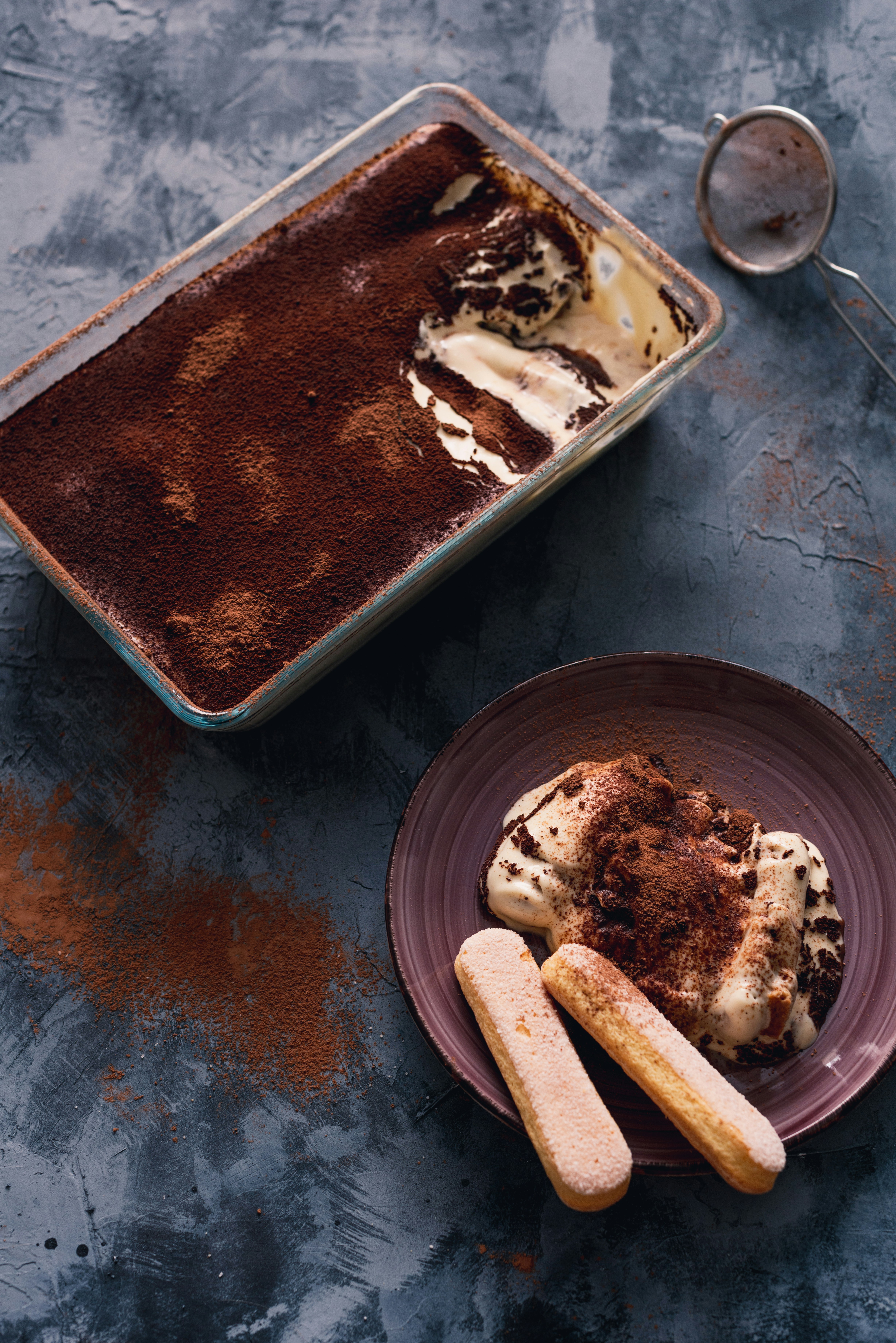 Layers of espresso-soaked ladyfingers and mascarpone cream, dusted with cocoa powder.